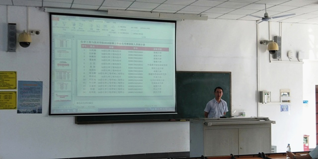 2019年10月15日下午15:30化学工程与技术学院在教学楼4-201教室召开2020届毕业生考研志愿报考辅导暨毕业生就业工作动员会。会议由学院学工办主任王克岩主持,参加会议的有学院党委书记冯广波、学院副院长李嘉诚、副院长贾春满以及2020届本硕毕业生。