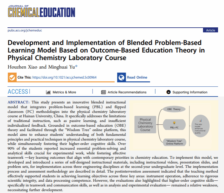 基础化学实验教学中心的重要教学研究成果“Development and Implementation of Blended Problem-Based Learning Model Based on Outcome-Based Education Theory in Physical Chemistry Laboratory Course”(J. Chem. Educ. 2026, DOI:10.1021/acs.jchemed.5c00964)在美国化学会旗下的《Journal of Chemical Education》(JCE)上发表。基础化学实验教学中心肖厚贞老师为论文第一作者,欧乐影院