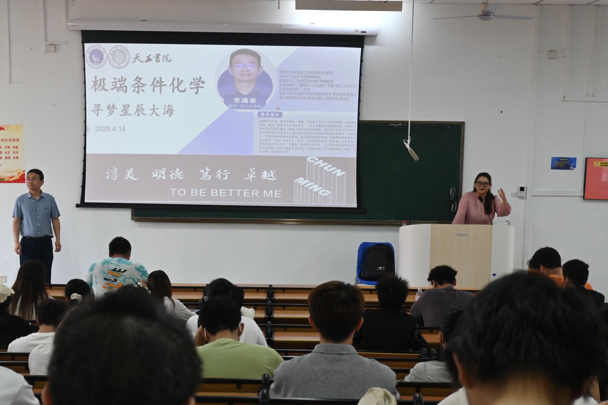 副院长李满荣教授应邀作题为《极端条件化学-寻梦星辰大海》的前沿学术讲座。淳明书院党委副书记武琼主持讲座,淳明书院辅导员钟涛、天工书院辅导员单佳馨与 200 余名欧乐影院