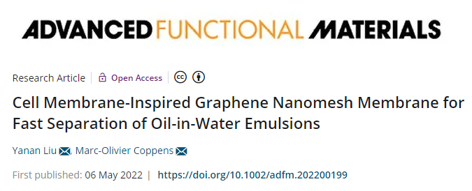 刘亚楠教授和英国伦敦大学学院(UCL)Marc-Olivier Coppens教授受细胞膜结构(包括具有用于选择性传输的亲水门和用于与水低摩擦的疏水通道的水通道蛋白)的启发,通过真空辅助自组装工艺制备造了一种石墨烯纳米网(GNM)膜。在GO纳米片上构建纳米孔以增加传质通道的数量并降低传质通道长度来制备石墨烯纳米网。结合石墨烯片和水之间的低摩擦,实现了超快速、选择性的水通量。亲水的壳聚糖用于修饰GNM以构建水合层,从而抑制污染物接触膜表面。因此,该石墨烯纳米网膜的渗透通量几乎达到4000 L m-2 h-1 bar-1,约为GO膜渗透通量的260倍。该膜在分离多种表面活性剂稳定的水包油乳液方面表现出优异的防污性能,多种乳液的水通量恢复率均超过96.7%,循环3次后仍保持在95.2%以上。相关工作以“Cell Membrane-Inspired Graphene Nanomesh Membrane for Fast Separation of Oil-in-Water Emulsions”为题发表在国际顶级期刊《Advanced Functional Materilas》上。