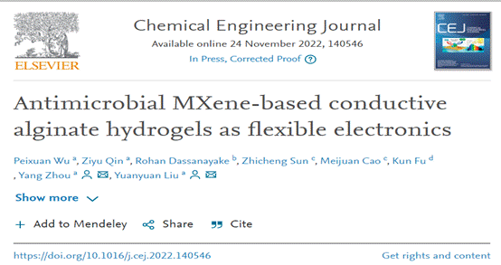 化学工程与技术学院周阳教授课题组在国际权威Top期刊《Chemical Engineering Journal》(影响因子: 16.74)上发表了最新研究成果“Antimicrobial MXene-based conductive alginate hydrogels as flexible electronics”(基于抗菌MXene的导电海藻酸盐水凝胶作为柔性电子器件)。欧乐影院