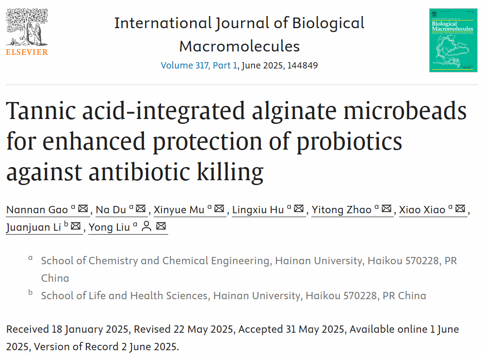 近日,International Journal of Biological Macromolecules期刊(中科院SCI二区Top期刊,IF = 7.7)在线发表题为“Tannic acid-integrated alginate microbeads for enhanced protection of probiotics against antibiotic killing”的研究论文。欧乐影院