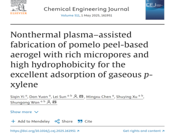 近期,污染物控制与有机质资源化团队在中科院一区Top期刊《Chemical Engineering Journal》(IF=13.4)发表题为“Nonthermal plasma-assisted fabrication of pomelo peel-based aerogel with rich micropores and high hydrophobicity for the excellent adsorption of gaseous p-xylene”的最新研究成果。欧乐影院