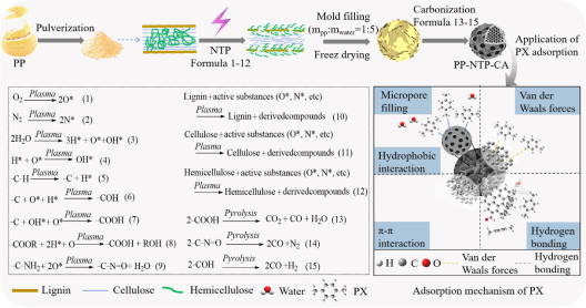 非热等离子体(NTP)是一种新兴技术,为材料改性提供了绿色、简单、有效的解决方案。迄今为止,采用NTP改性技术制备吸附材料用于去除疏水性VOC的研究非常有限。本研究以农业废弃生物质柚子皮(PP)为原料,通过NTP放电产生的活性物种·OH、·O2−和O3等对PP改性修饰并制备具有丰富微孔和高疏水性的柚皮基碳气凝胶(PP-NTP-CA)。结果表明,PP-NTP-CA的微孔表面积和体积为580.66 m2 g−1 和0.23 cm3 g−1,分别是对照组PP-CA的18倍和23倍。NTP修饰后,材料的平均孔径从15.98 nm大幅减小到1.59 nm,水接触角从80.9o增加到127.59o。
