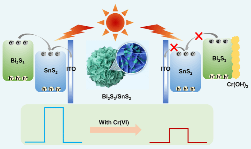 工作2:以钙钛矿氢氧化物ZnSn(OH)6为前驱体,采用连续离子层吸附反应法构建了三维花状SnS2/Bi2S3异质结,使用该异质结构筑的光电化学传感实现了Cr(VI) 的灵敏检测。该成果以题为“Perovskite hydroxide ZnSn(OH)6-derived three-dimensional flower-like SnS2/Bi2S3 heterojunction for sensitive photoelectrochemical detection of Cr(VI)”发表于《Rare Metals》期刊。欧乐影院