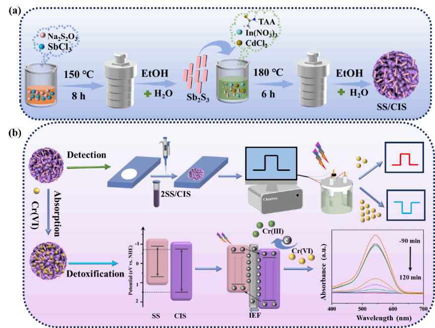 工作1:设计合成了一种双功能Sb2S3/CdIn2S4 p-n异质结,同时实现了Cr(VI)的光电化学灵敏检测和光催化解毒。所制备的光电化学传感器在稳定性、选择性和重现性方面均达到实用水平,在环境领域展现出重要应用潜力。该成果以“Difunctional Sb2S3/CdIn2S4 p-n Heterojunction: A Novel Material for Ultra-Wide-Range Photoelectrochemical Sensor with Photocurrent-Polarity Switching and Photocatalytic Detoxification of Cr(VI)”为题发表于《Chemical Engineering Journal》期刊。欧乐影院