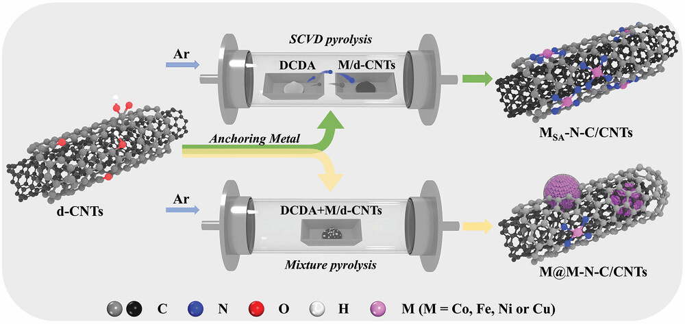 功能分子器件团队提出了一系列创新设计策略,以精准调控氧物种在活性位点上的吸附与还原行为。团队发展了一种基于“分离气相化学沉积”的普适性方法,在碳纳米管载体上构筑同轴钴-氮-碳单原子催化剂。所制备的同轴结构单原子催化剂在酸性电解液中展现出优异的氧还原活性、选择性与长期稳定性,实现了超过100小时的稳定高效电合成过氧化氢性能。相关成果以Coaxial Metal-Nitrogen–Carbon Single-Atom Catalysts Boost Acid Hydrogen Peroxide Production为题发表于材料领域中国科学院一区TOP期刊Advanced Functional Materials杂志,欧乐影院