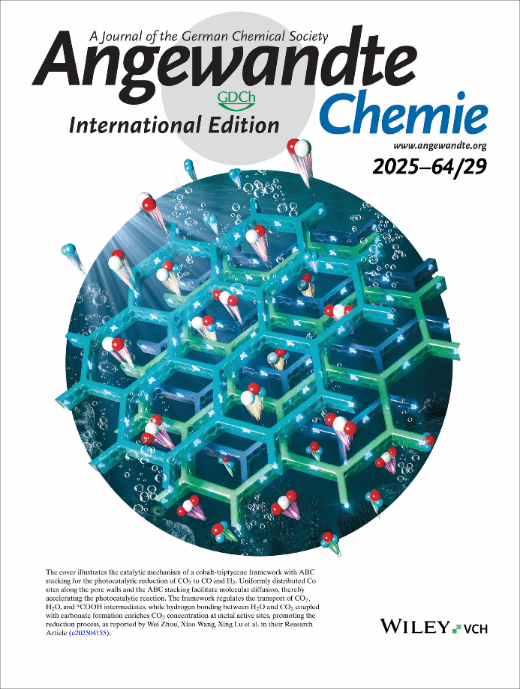 功能分子器件团队在化学领域中国科学院一区TOP期刊Angewandte Chemie杂志上发表了题为Staggered ABC-Stacking Cobalt-Triptycene Framework for Accelerating CO2 Photoreduction的研究论文,并被选为封面论文。该研究在纯水相中合成了错层ABC堆剁的钴基三蝶烯框架,实现了高达90%的产率且具备一定的环境兼容性(在东坡湖、白沙门公园等自然水域采集的水样中亦可合成)。进一步地,研究团队通过密度泛函理论计算与分子动力学模拟和主成分分析进一步发现,CO生成速率与Ik值、光学带隙及ΔG*H等因素呈现强相关性,由此修正了以往认为ΔG*COOH是光催化性能主要因素的观点。这项研究为高效二氧化碳还原光催化剂的设计原理提供了理论依据。卢兴教授组2025级博士研究生吴俊豪、硕士研究生卢鑫慧为该论文的共同第一作者,欧乐影院