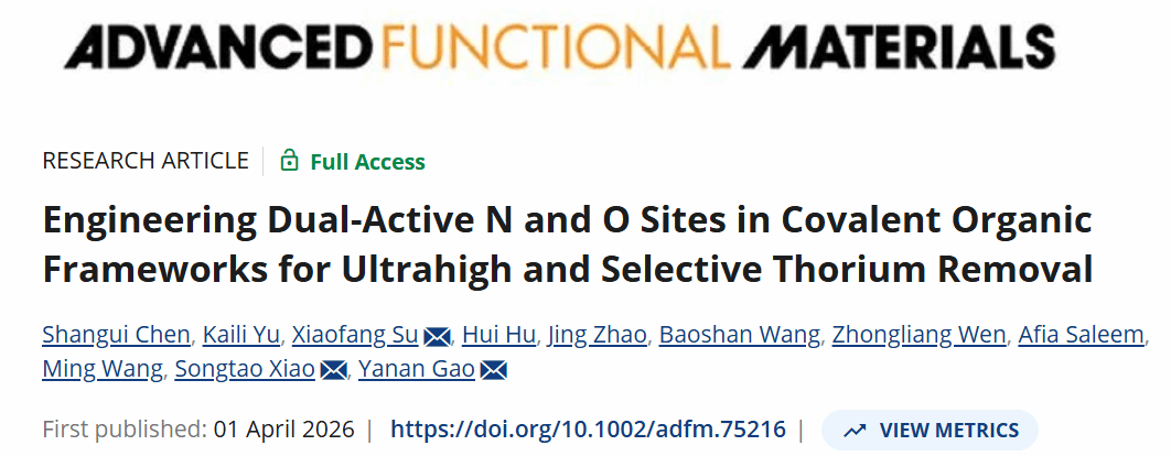 能源材料先进制造与应用团队基于软硬酸碱(HSAB)理论,设计合成了一系列富氧基团功能化的亚胺键连接二维共价有机框架(2D COFs)。凭借骨架中丰富的高亲和性双活性N,O位点,材料实现了快速吸附动力学与卓越的Th(IV)捕获性能。相关研究成果以“Engineering Dual-Active N and O Sites in Covalent Organic Frameworks for Ultrahigh and Selective Thorium Removal”为题发表于期刊《Advanced Functional Materials》(中国科学院一区Top,IF=19)。欧乐影院