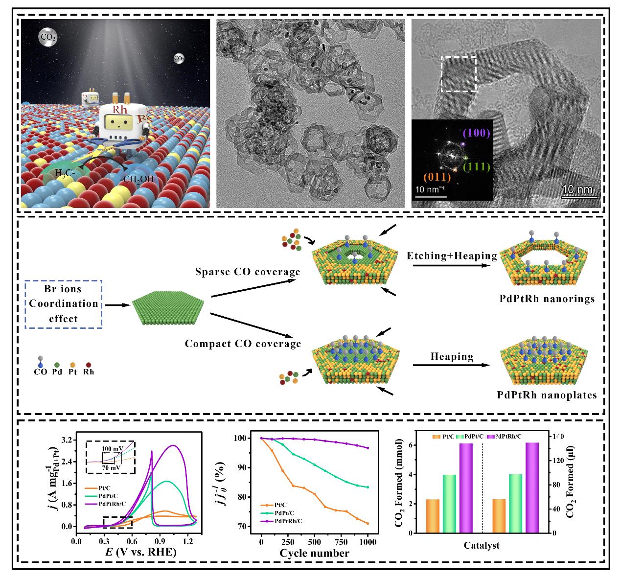田新龙教授团队通过简单的一锅溶剂热法制备了一种具有高性能的二维三元Pd3Pt1Rh0.1纳米环(NRs)催化剂,并对其性能和C−C键选择性的机理进行了系统研究。特别是优化后的催化剂表现极高的质量活性、稳定性、抗毒性和C−C键断裂能力。这一可观的实验结果归因于其独特的中空结构,提供了丰富的活性位点。高的抗毒性不仅归功于Rh原子对催化剂材料的电子调控,还取决于Rh优异的水活化性能,有助于CO等中间体的去除。此外,密度泛函理论(DFT)计算表明,Rh的引入显著增强了催化剂的C−C键裂解能力,进一步提高了EOR活性。