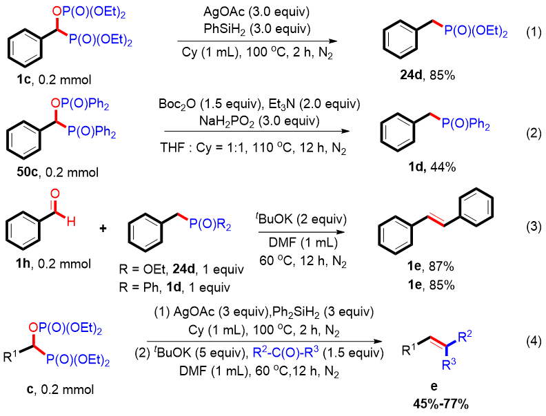 在实验过程中,作者通过质谱检测到了微量的苄基磷氧化合物,随后作者经过大量的条件筛选,最终确定了最优的脱氧磷酸化反应的条件。在原双磷酸化反应的基础上,额外添加次磷酸钠作为还原剂,利用THF与Cy为混合溶剂,苯甲酸可以与二苯基磷氧反应生成相应的脱氧磷酸化产物。此外,为进一步探究该反应的实用价值,作者还进行了衍生化实验。在脱氧磷酸化的体系中,亚磷酸酯类化合物仅能检测到微量的脱氧磷酸化产物-苯基磷化合物。令人高兴的是,乙酸银能够促进二苯基硅烷还原双磷酰化合物,以85%的产率,生成相应的苄基磷化合物。与此同时,双磷产物可以被次磷酸钠还原为苄基磷产物。随后,作者将苄基磷产物应用于与苯甲醛的WHE反应中,均以高的产率得到了相应的烯烃产物。作者还结合双磷化合物的还原反应以及随后与醛或酮的WHE反应,一锅以中等偏上的产率合成相应的烯烃化合物。这些结果表明,羧酸能够通过该反应路径很容易地转化为烯烃,在有机合成中展现出广泛的应用前景。