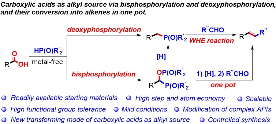 总的来说,陈铁桥教授团队在无金属条件下实现了羧酸的双磷酸化和脱氧磷酸化反应,选择性地生成了相应的含P-C-O-P结构的双磷化合物和苄基磷化合物。该反应能与WHE反应有效串联,为羧酸转化为烯烃提供了一种有效的方法。羧酸和P(O)H化合物的底物范围都很广,具有很高的官能团耐受性。克级规模放大实验和在复杂原料药晚期修饰的应用也说明该新反应具有很强的实用性。这项工作利用羧酸为烷基源,发展了羧酸的转化新模式,拓展了羧酸的应用范围,为相关有机磷化合物和烯烃的制备提供了有效的方法。
