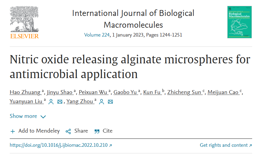 化学工程与技术学院周阳教授课题组在中科院1区国际权威Top期刊《International Journal of Biological Macromolecules》(影响因子:8.025)上发表了最新研究成果“Nitric oxide releasing alginate microspheres for antimicrobial application”( 释放一氧化氮的海藻酸盐微球在抗菌方面的应用)。欧乐影院