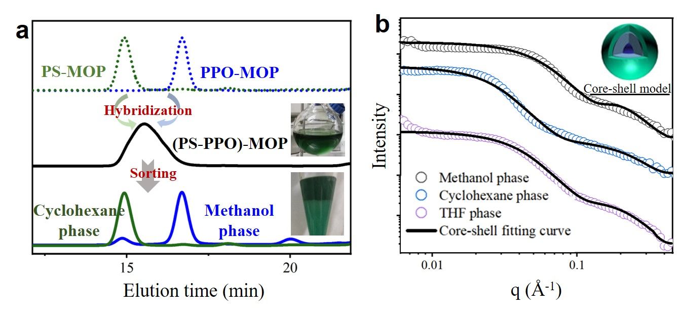 在此研究基础上,进一步设计了MOP基MSPs的配体交换环境和条件,实现了热力学稳定状态的、不同组分的、不同比例的MSPs的制备。有趣的是,相比传统动力学控制的MSPs制备方法,通过配体交换所制备的MSPs具有超窄的分子量分布(PDI),这说明了所得的MSPs具有更理想的分子级共混特征。响应的分子结构演化过程,通过非接触式溶液SAXS和SANS测试技术得到较充分的论证。这种优异的热力学结构稳定性,使得材料在服役环境下表现出稳定的物理化学性质。
