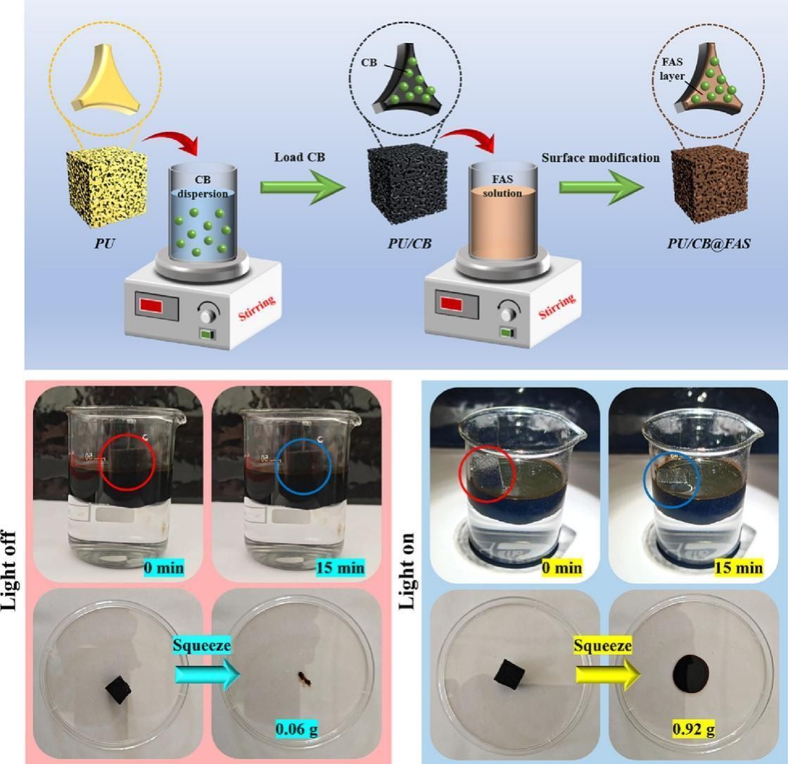 PU/CB@FAS海绵的制备流程和光热吸附原油图。