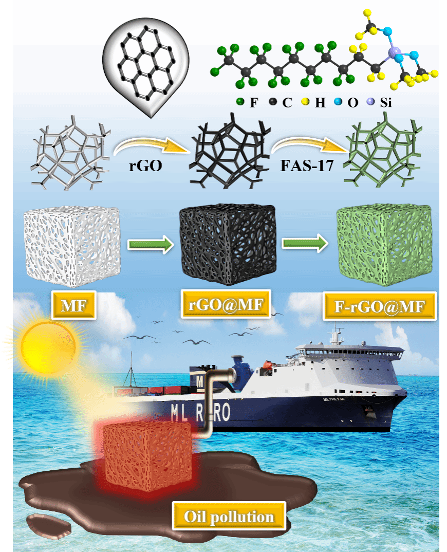目标海绵的生产过程(F-rGO@MF)和太阳能供电的自热海绵介导的原油泄漏清洁技术示意图。