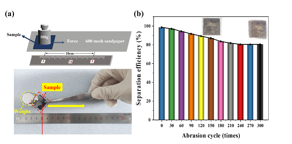 化工学院高助威副教授团队研究成果,题目为“Preparation and research of Mn-TiO2/ Fe membrane with high efficiency light-oil/water emulsion separation”。 该成果使用不锈钢网作为反应物之一,在酸性条件下将钛酸四丁酯(TBT)和醋酸锰形成的金属氧化物颗粒负载在棉网上,制备出具有优异油水分离性能的膜材料。结果表明,高温水热反应制备的0.1/0.3/0.5 Mn-TiO2/Fe膜在10次循环后的轻油水分离中具有优异的分离效果。同时,经酸、碱及高温、低温处理后,膜仍具有良好的疏水性。在与砂纸摩擦15次后测量的轻油水分离实验中,0.5Mn-TiO2/Fe膜表现出良好的耐久性。这种不锈钢网负载在膜表面的多样化润湿性和分离过程在环保、能源利用、工业制造等方面具有广泛的潜在应用。文章链接://doi.org/10.1016/j.surfin.2022.101995。
