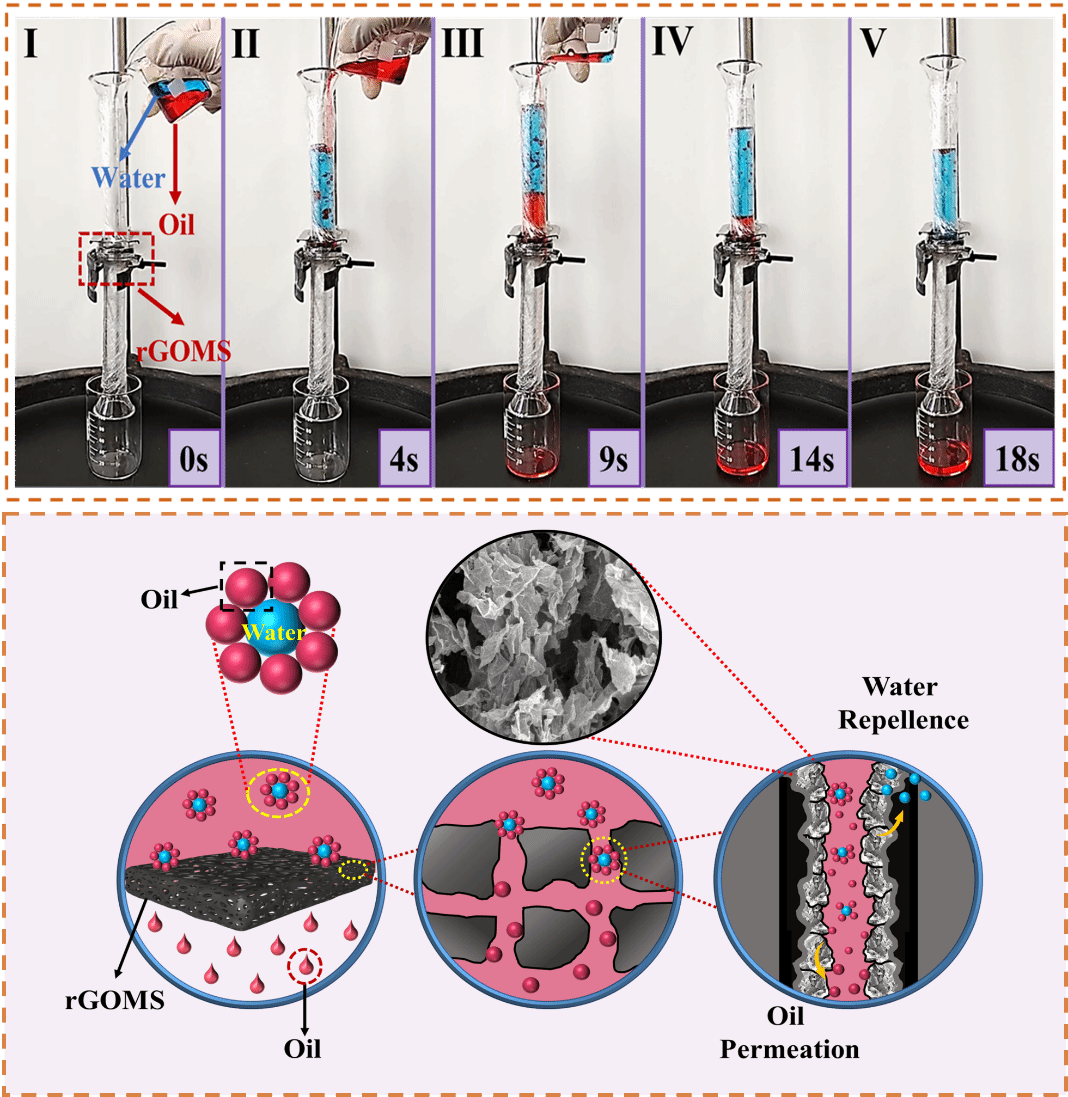 rGOMS的油水分离流程图和乳液分离机理。