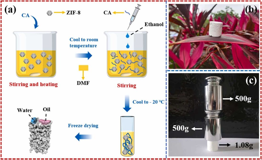ZIF-8掺杂醋酸纤维素多孔泡沫制备流程及机械强度。