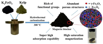 生物炭,作为一种具有丰富孔隙结构和多样化官能团的廉价碳基材料,在水体污染物治理领域有着广阔的应用前景。因其原料来源丰富、可再生,同时有固碳功能,备受各领域学者关注。然而,传统的热降解方法制备的生物炭性能相较低下,且存在分离难的问题,严重限制其推广应用。本文以强氧化性铁盐(K2FeO4)为磁性介质前体和内在氧化剂,通过简便的K2FeO4促进海带水热碳化一步高效制备多孔富氧强磁性生物炭,获得对抗生素污染物四环素高达1245.43 mg/g的吸附性能和56.48 emu/g 饱和磁强度。此外,该K2FeO4促进水热碳化策略对不同生物质废弃物原料都表现出良好的普适性和高效性。