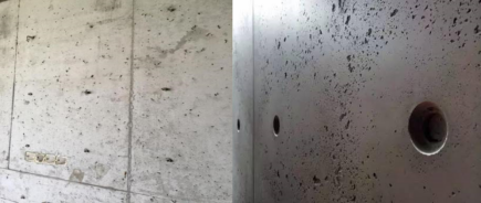 聚羧酸系减水剂(Polycarboxylate superplasticizer, PCE)是目前研究和应用最广泛的清水混凝土外加剂。然而,由于PCE分子结构中的聚醚侧链,容易引入大量气泡造成混凝土含气量过高,导致清水混凝土表观气泡多,难以达到清水混凝土外观色泽均匀、平整美观、无蜂窝麻面的要求,如图2所示。
