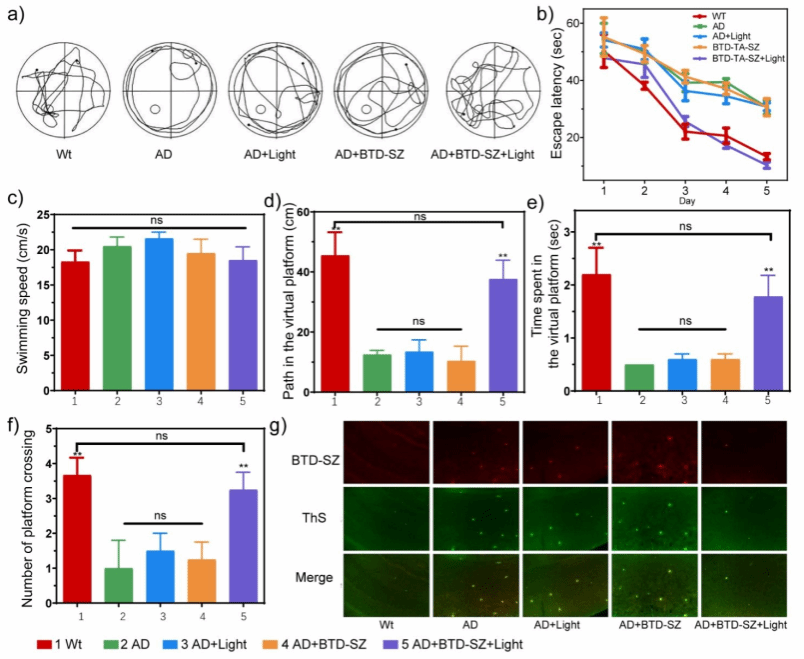 基于此,研究团队构建了4个探针分子(BTD-SZ、BTD-YD、BTD-TA-SZ和BTD-TA-YD),这几个分子的发光波长位于近红外区。研究结果表明,基于二甲基胺苯并噻二唑荧光团的BTD-SZ和BTD-YD具有优异的发光性能,在小鼠体内可无创检测Aβ斑块。采用三苯基胺团取代BTD-SZ和BTD-YD中的二甲基胺后得到新的分子探针,BTD-TA-SZ和BTD-TA-YD。实验研究发现,光激活下,BTD-TA-SZ可高效生成单线态氧,从而促进Aβ聚集体在光照射下的氧化解聚。体内实验评估表明,BTD-TA-SZ介导的光氧化能有效降低转基因AD小鼠脑部Aβ斑块并缓解神经元损伤。理论计算显示聚集态增强了分子单线态与三线态之间的旋轨耦合效应,从而促进了激发态电子的隙间穿越速率,增强了单线态氧生成效率。本文的研究结果为AD的靶向诊疗提供了新思路。