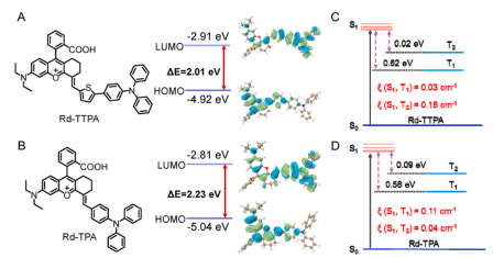 具有适当分子运动基团的强供体(D)-受体(A)型分子通常会减小单线态(S1)和三重态(T1)之间的能隙ΔEST,促进T1态的形成,进而促进ROS的产生。该研究设计了一种新的A-π-D1-D2型分子Rd-TTPA,其具有增强的D-A相互作用和分子内运动,其中罗丹明支架作为电子受体(A)和π共轭体系,噻吩环和三苯胺单元分别作为第一和第二供体(D1,D2),以及可旋转的乙烯基和C-C单键以增加分子内运动。在超声波照射下,Rd-TTPA可以在溶液中有效地产生大量的O2-•,使其能够作为声敏剂。细胞和体内研究证明,Rd-TTPA通过其正电荷主动靶向癌细胞的线粒体,并通过SDT产生的ROS诱导细胞焦亡,通过焦亡增强SDT达到良好的抗肿瘤效果。此外,Rd -TPA还具有优异的NIR-II荧光发射能力(λmax=1000 nm)和较大的斯托克斯位移(340 nm),这更有利于体内精确的肿瘤成像,有助于按需联合治疗。
