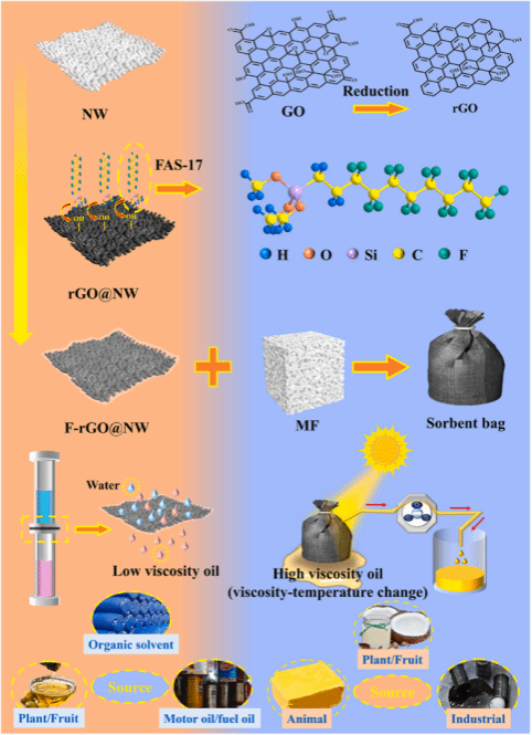 随着工业化进程的加速,油类污染已成为全球性的环境问题,传统的油水分离技术往往面临分离效率低、耗时长、成本高,甚至可能造成二次污染。因此,开发新型高效的油水分离技术具有重要的现实意义。本研究开发了一种基于硅烷接枝石墨烯的超疏水涂层非织造布(F-rGO@NW)。通过在非织造布表面构建还原氧化石墨烯-三甲氧基(1H,1H,2H,2H-十七氟癸基)硅烷(FAS-17)涂层,制备出具有光热性能的超疏水膜材料。该材料不仅展现出超疏水特性,还具有良好的耐酸碱性和自清洁性能。通过结合重力、吸附、泵送和光热驱动等多种分离动力学,实现了对多种油水混合物的高效分离,其中n-己烷/水的分离效率高达99.052%,油通量高达14.644 kL/(h·m²)。此外,通过将修饰后的非织造布与三聚氰胺泡沫结合制备的吸附袋,能够在光强度为2 kW·m⁻²的条件下,7分钟内吸附4.8克黄油,展示了其在光热油驱动领域的应用潜力。