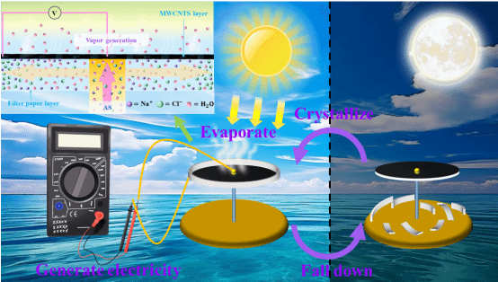 界面光热水蒸发技术结合盐结晶处理有望在实际中应用。本研究通过滤纸来负载MWCNTs,用棉棒作为输水通道,组装了0.5-MC@FP蒸发器。制备了不同滤纸层的0.5-MC@FP蒸发器,通过测试来验证0.5-MC@FP蒸发器的蒸发效率和盐回收性能。结果表明在光照下(1kW/m2),0.5-MC@FP-1 的蒸发速率可达到1.33 kg/m2·h,分离蒸汽和盐的效率为80.35%。0.5-MC@FP蒸发器在干燥时光照240 s后,表面温度可达到70 °C以上。0.5-MC@FP-1在10个循环天数的平均蒸发速率和盐回收率分别为1.31 kg/m2·h和39.77 g/m2·h。并且能实现144 h的连续水蒸发和边缘盐结晶分离。另外0.5-MC@FP蒸发器在600 s内能连续的输出电压。这项工作展示了一种可循环连续蒸汽产生、盐收集和连续发电的界面光热蒸发器,为解决水蒸发时盐结晶问题和蒸发器的水传输调控提供了新方向。
