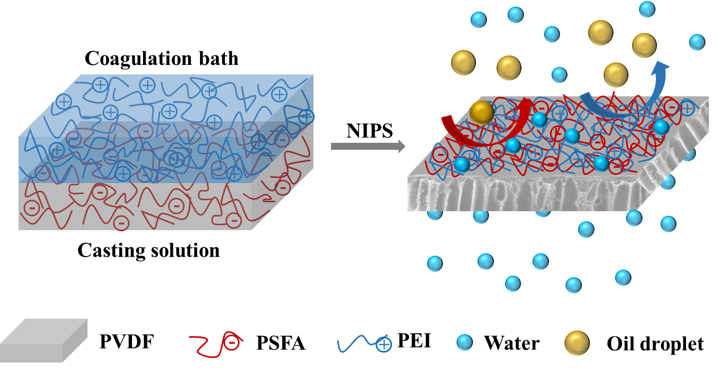 姜忠义教授团队利用静电相互作用增强的表面偏析法,以带负电荷的全氟磺酸(PFSA)作为铸膜液中的表面偏析剂,带正电荷的聚乙烯亚胺(PEI)作为凝固浴中的交联剂,构建了一种异质抗污染膜表面。PSFA与PEI之间的静电相互作用增强了表面偏析的驱动力,强化了PFSA的表面偏析以及PFSA和PEI的稳定性,从而分别构建了低表面能微区和亲水性微区。所得膜在水下表现出超疏油性和超低油粘附性。同时,PFSA的加入促进了相转化,提高了膜的渗透性。因此,我们的膜在分离各种表面活性剂稳定的水包油乳液时,表现出367 L m-2h-1的水通量,水通量恢复率超过95%。此外,经过三次循环过滤实验后,水通量恢复率仍保持在90% 以上。欧乐影院