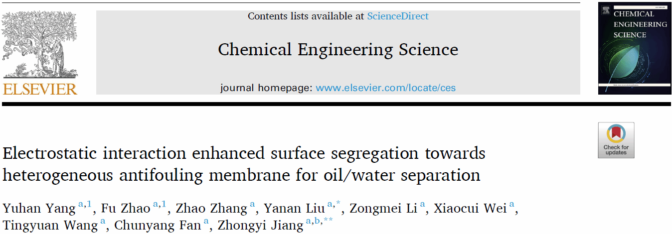 近日,姜忠义教授课题组在期刊《Chemical Engineering Science》(IF = 4.1)发表题为“Electrostatic interaction enhanced surface segregation towards heterogeneous antifouling membrane for oil/water separation”的研究论文。教育部讲座教授姜忠义教授、欧乐影院