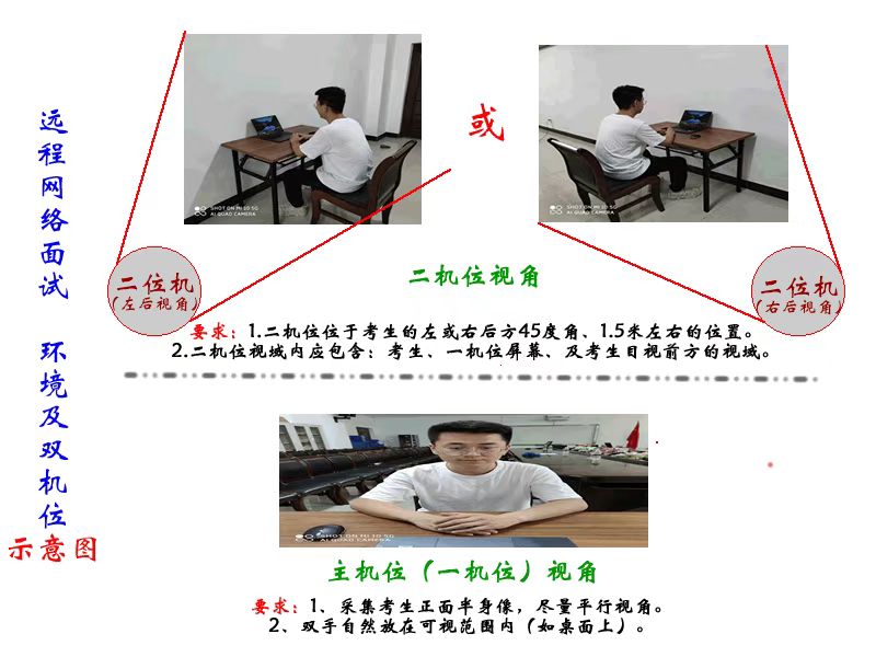 “双机位”,即考生面试过程中,需要有两台音视频设备同时在工作。一台为主机位(电脑端),负责采集考生正面上半身视频信息和音频信息;一台为二机位(手机端),负责采集考生所在环境的全景视频信息和音频信息。